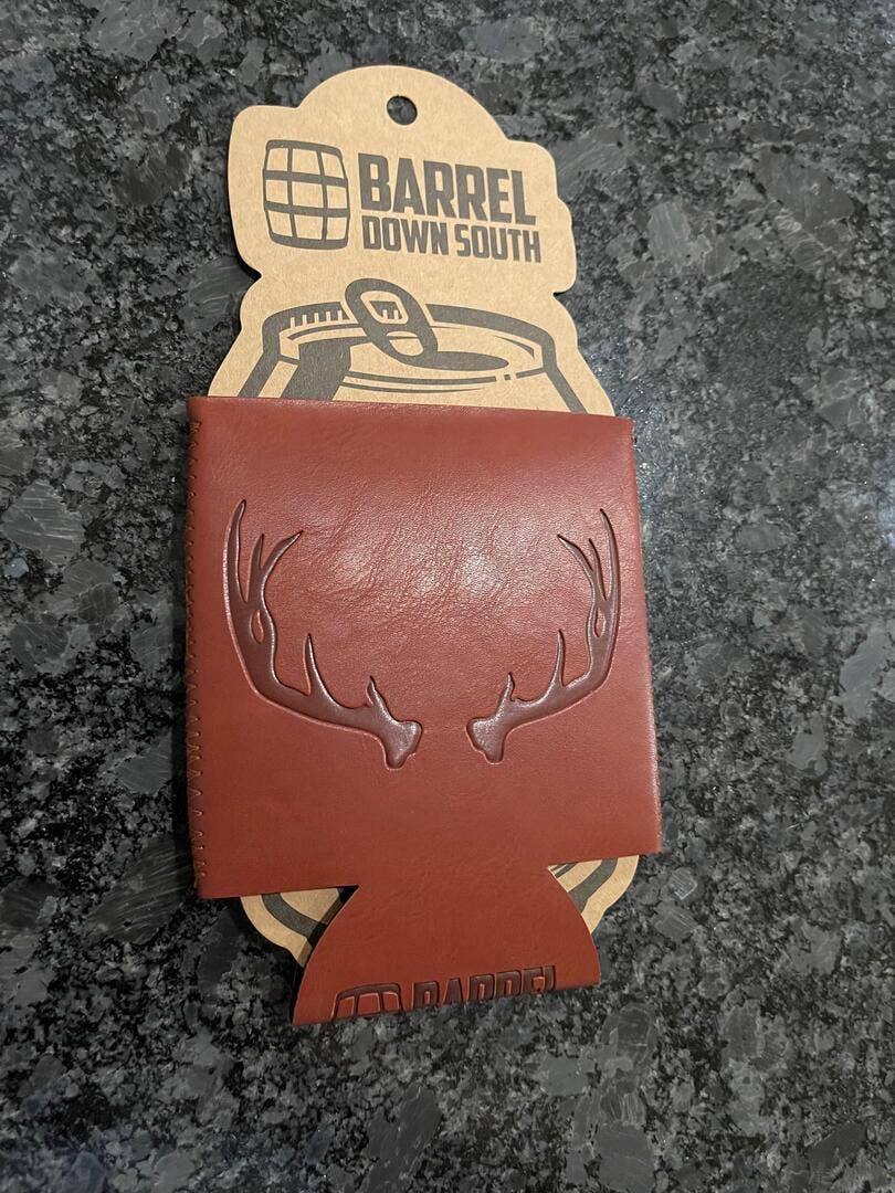 Our Deer Antler Hunting Can Cooler is made of faux leather and lined with neoprene to keep your favorite beverage ice cold.