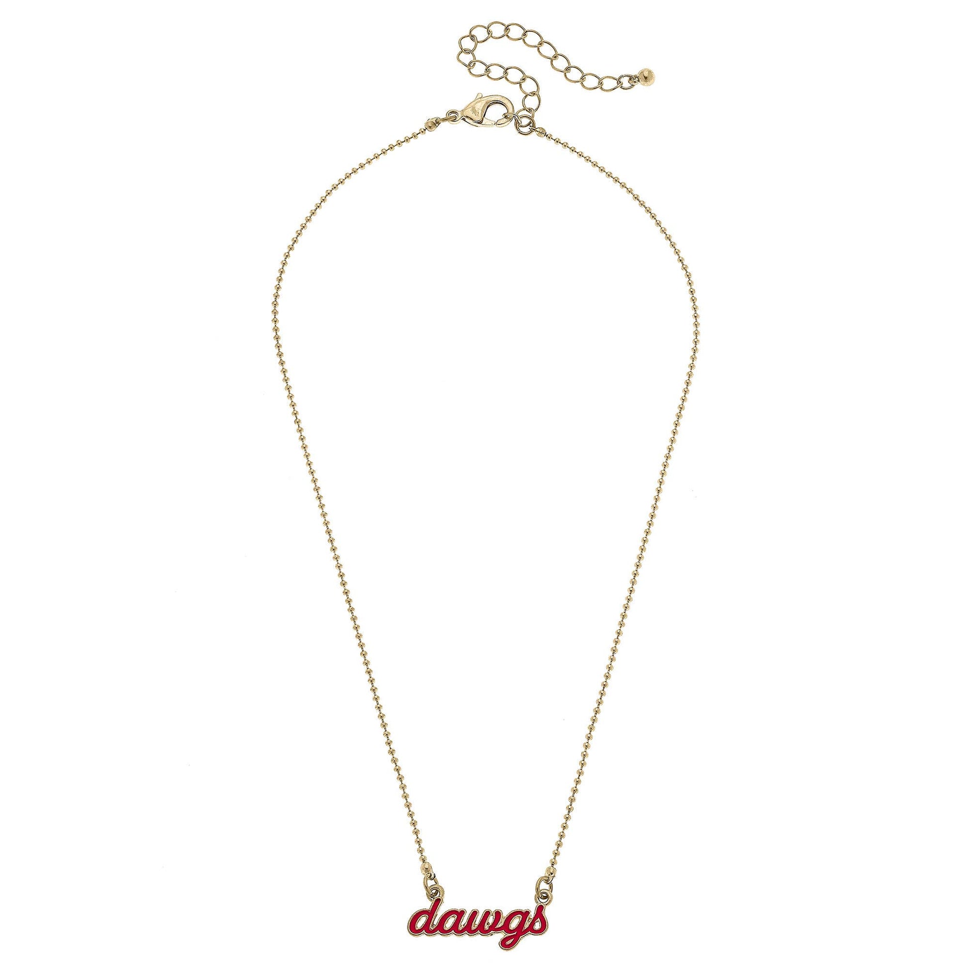 Represent your team in style with this Georgia Bulldogs Enamel Script Necklace in Red! Perfect for game day (or any day), this necklace features the iconic "dawgs" script. Show off your spirit with this dainty accessory.