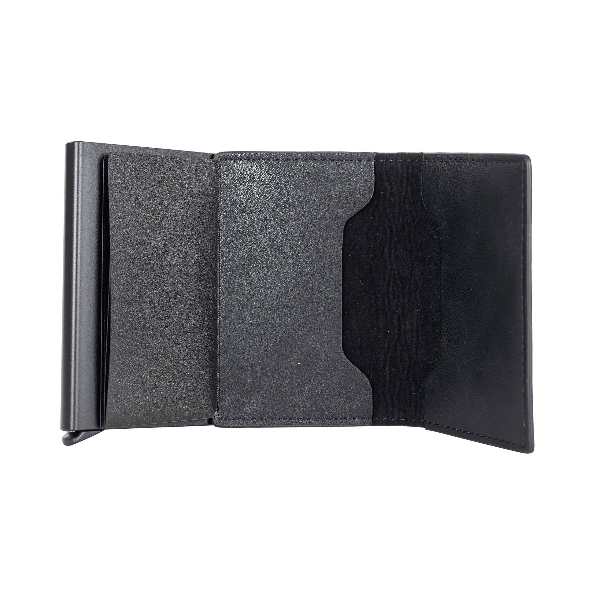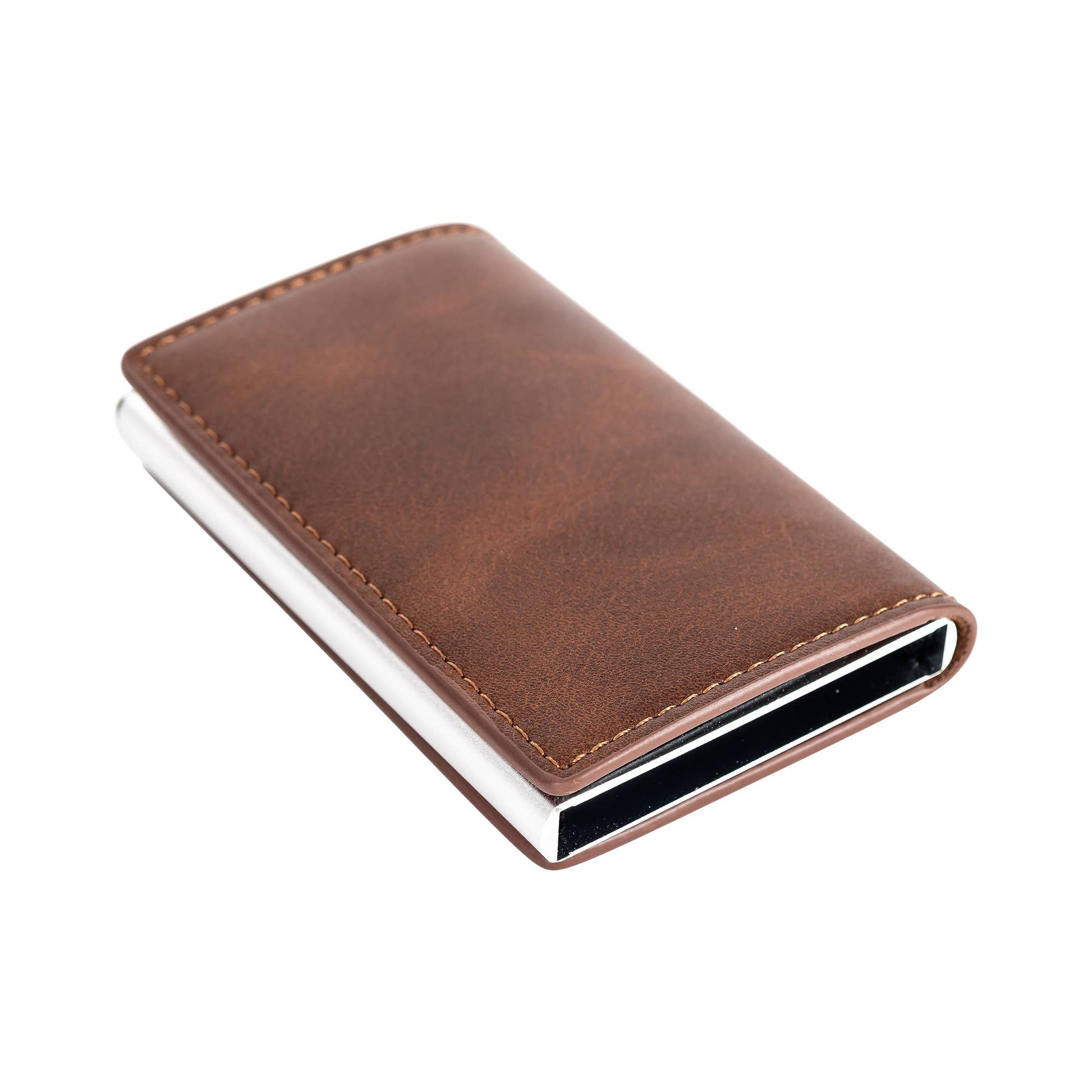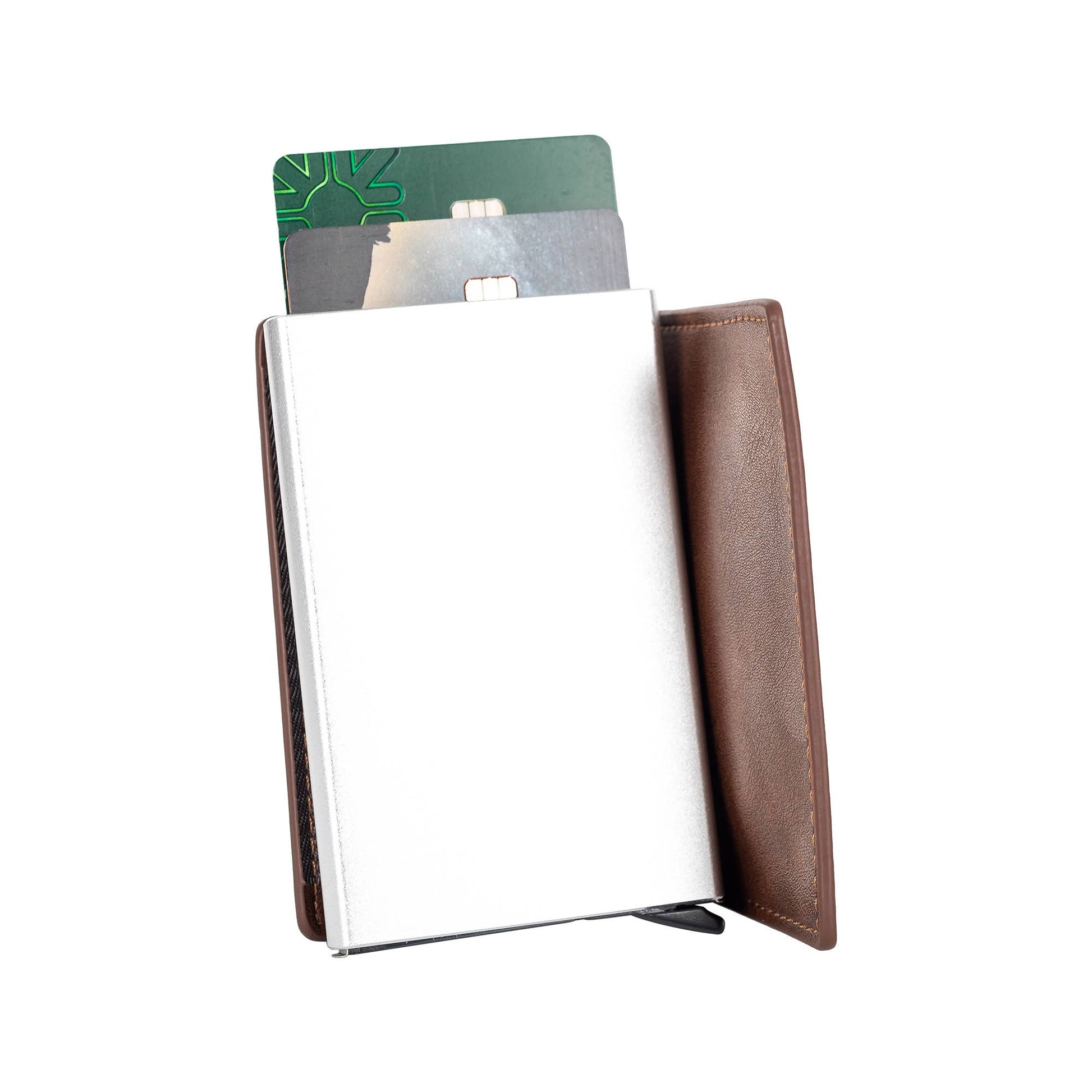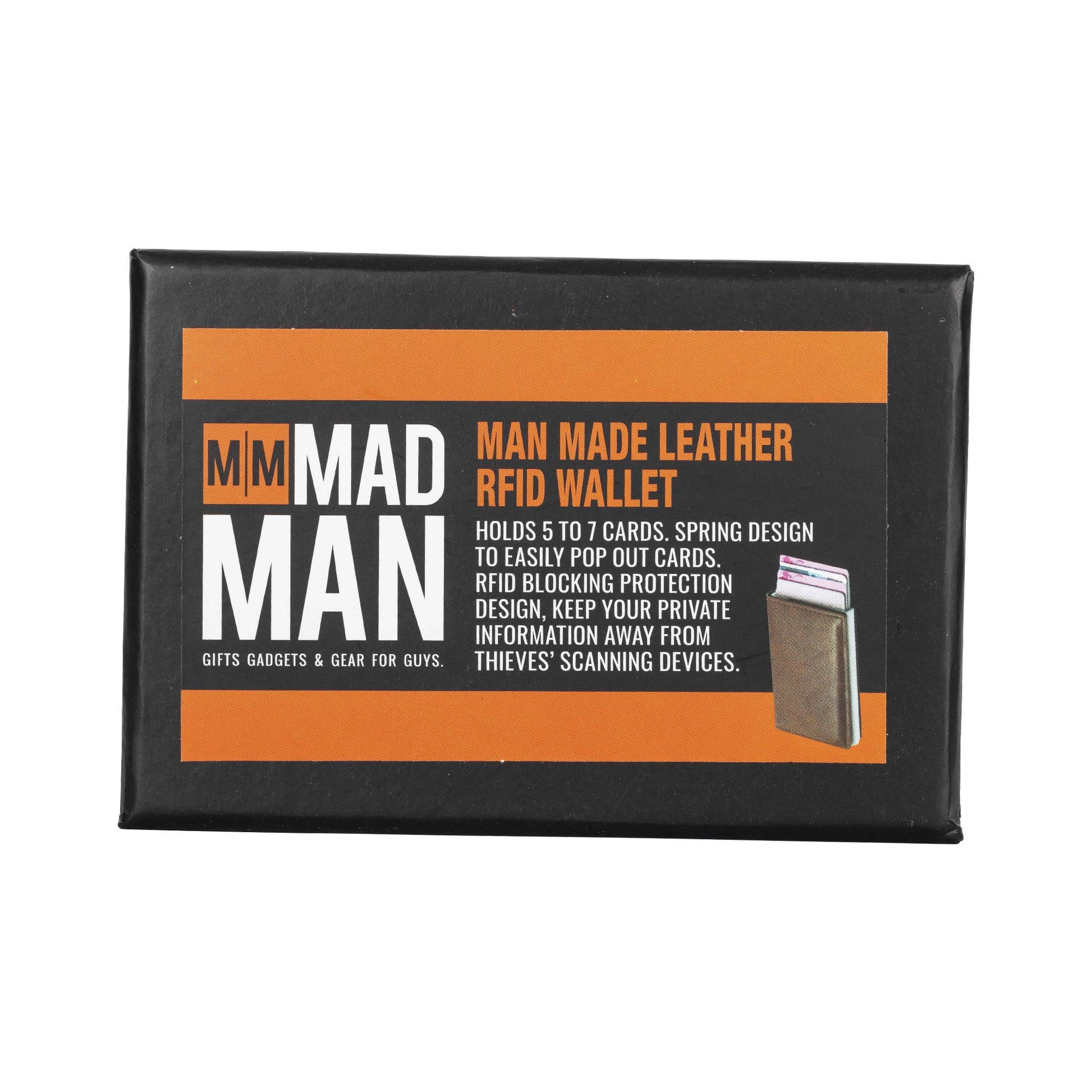 Sleek, manly and minimalist make the leather RFID wallet unique and awesome. Material: leather and acrylic. Features i.d. Pocket and holds 5 to 7 cards. Spring design to easily pop out cards. RFID blocking protection design.